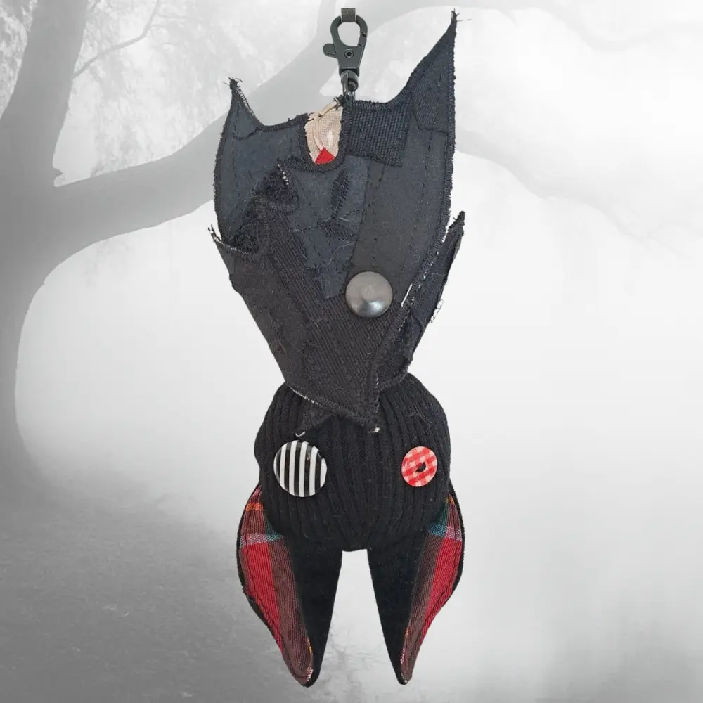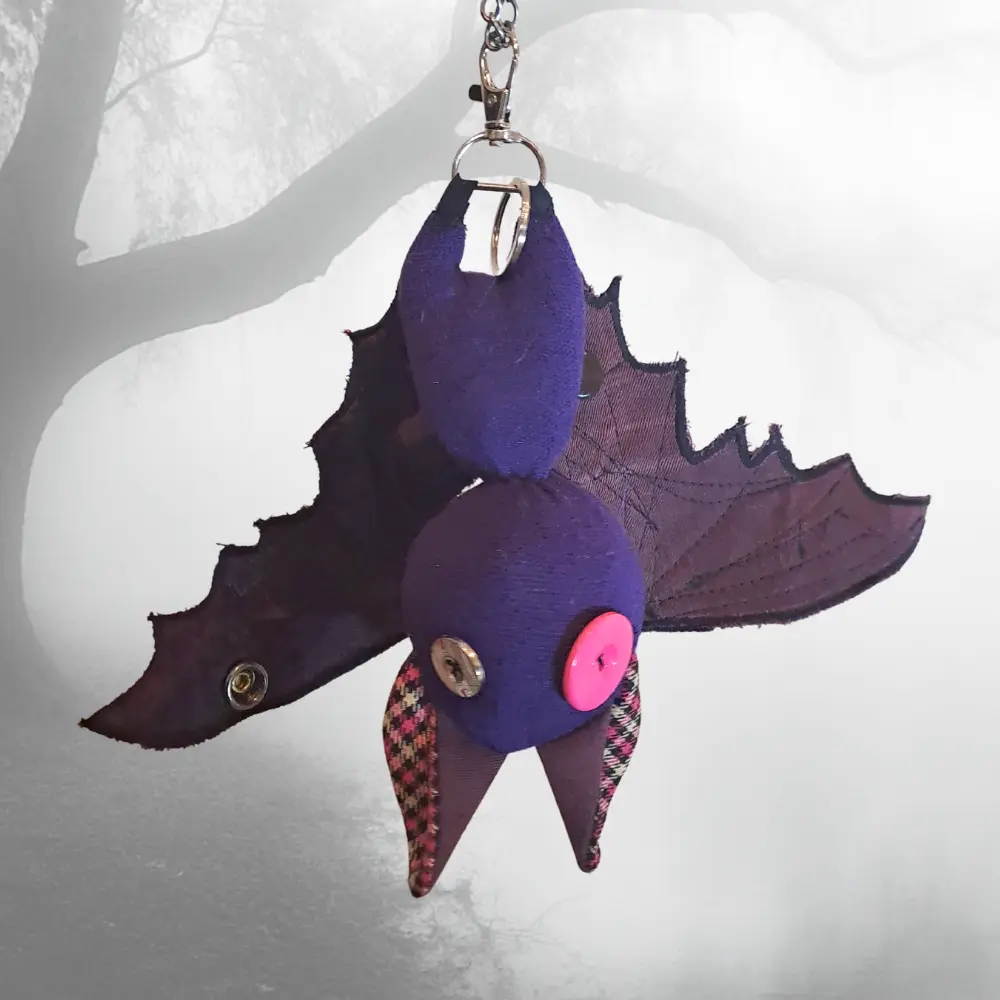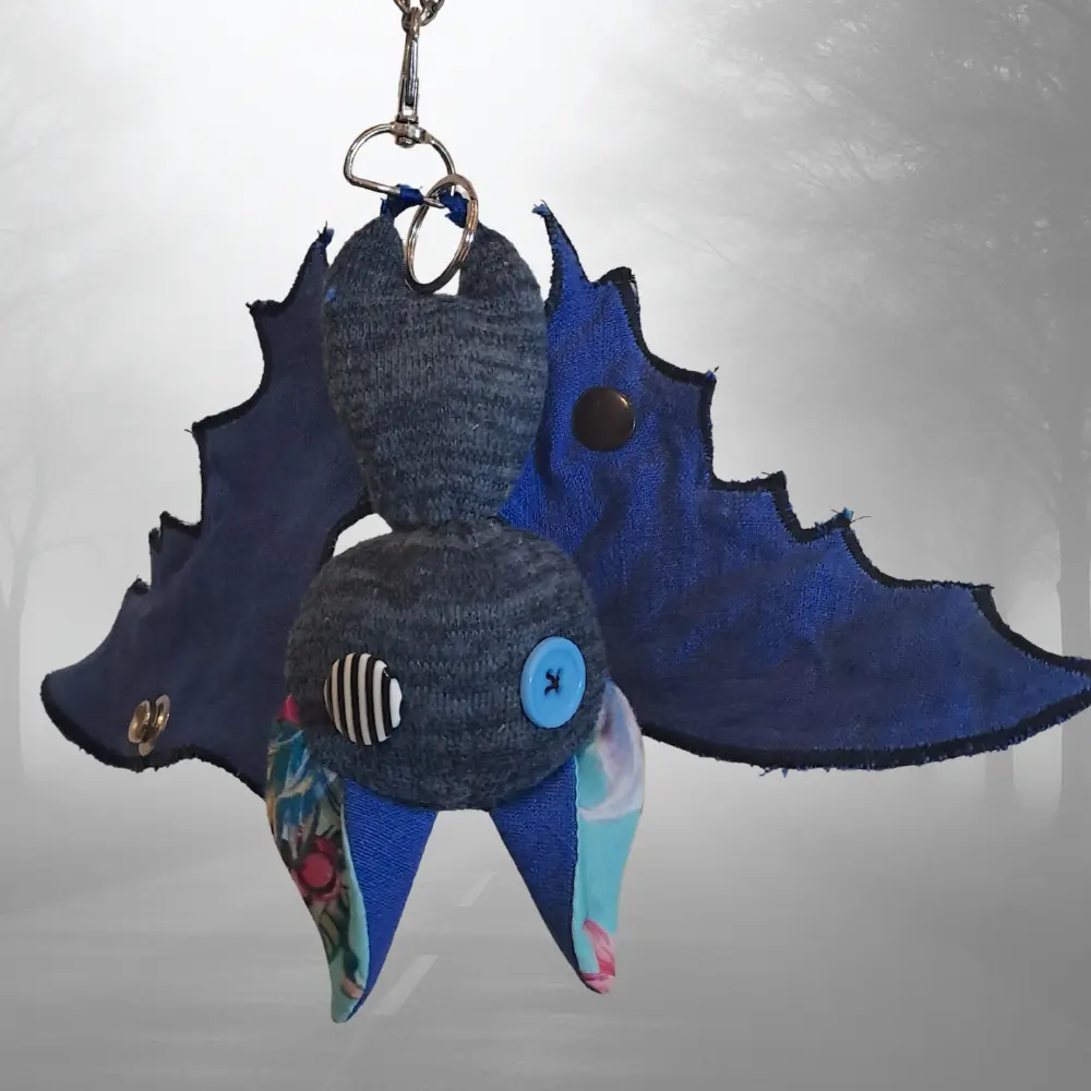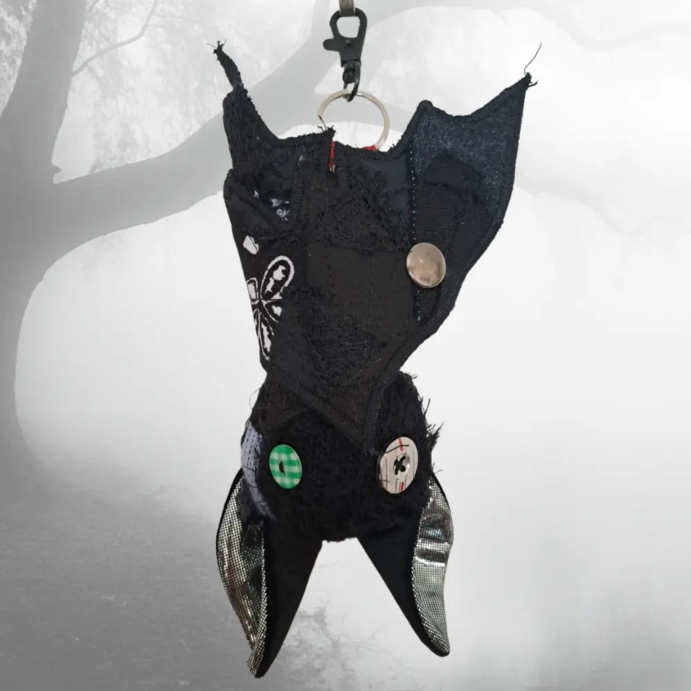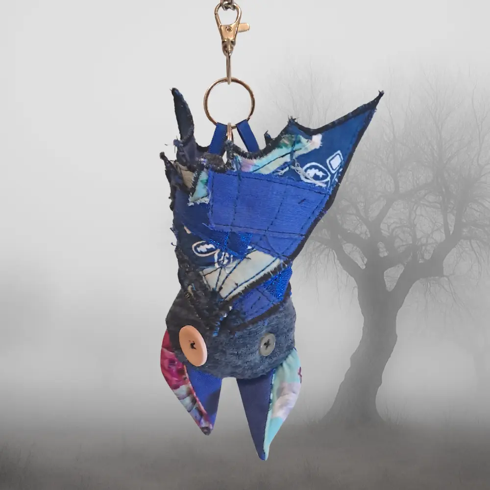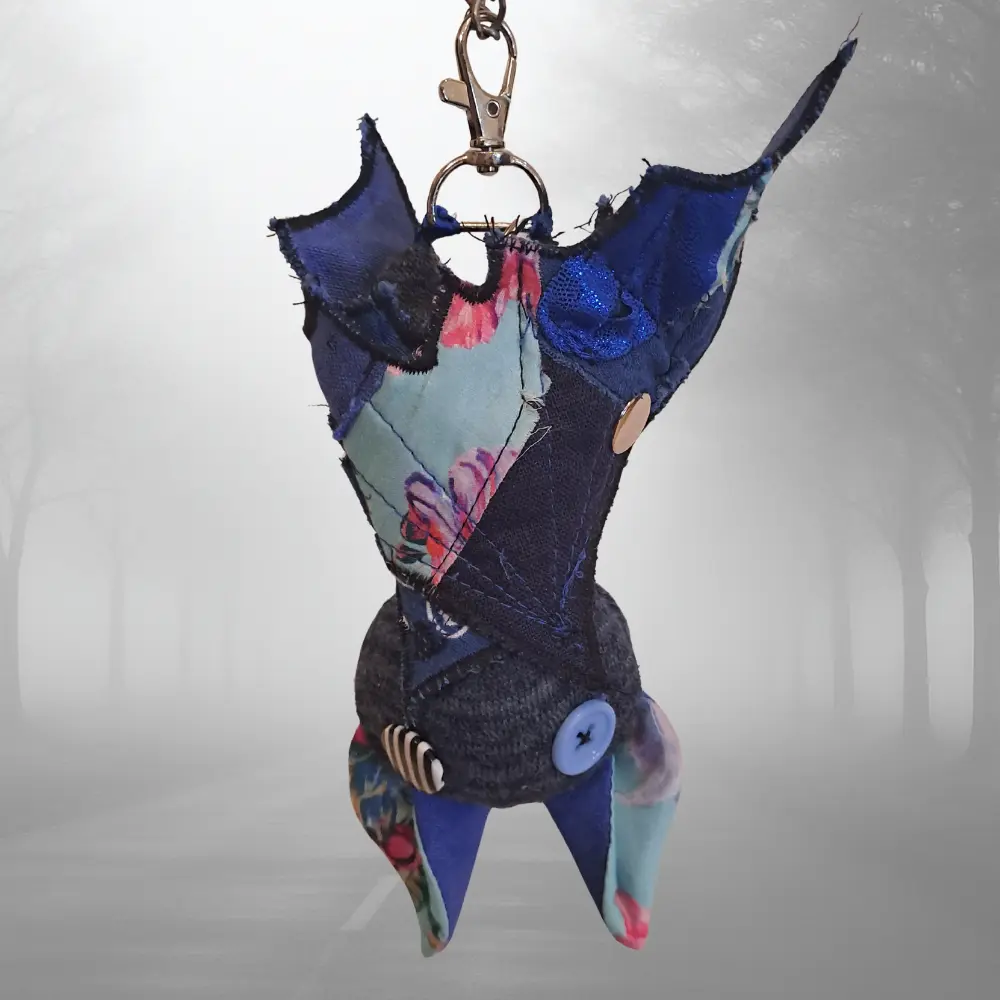 Upcycling con mucha actitud. Cada murciélago nace de los retales más pequeños — ninguno es igual al anterior. Para colgar del bolso, el pantalón, o donde te dé la gana.