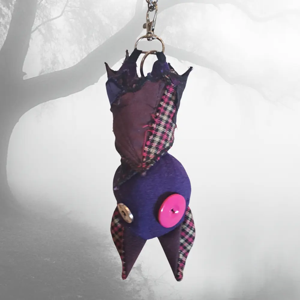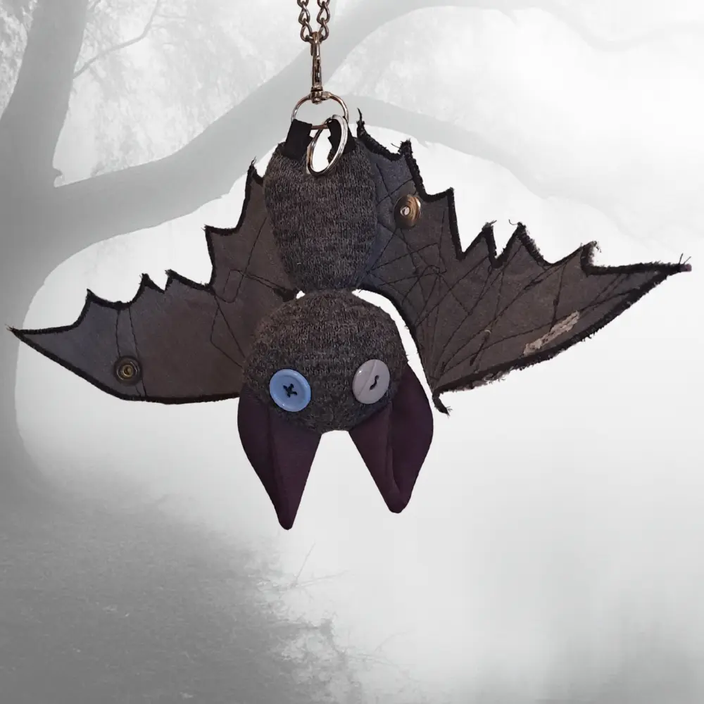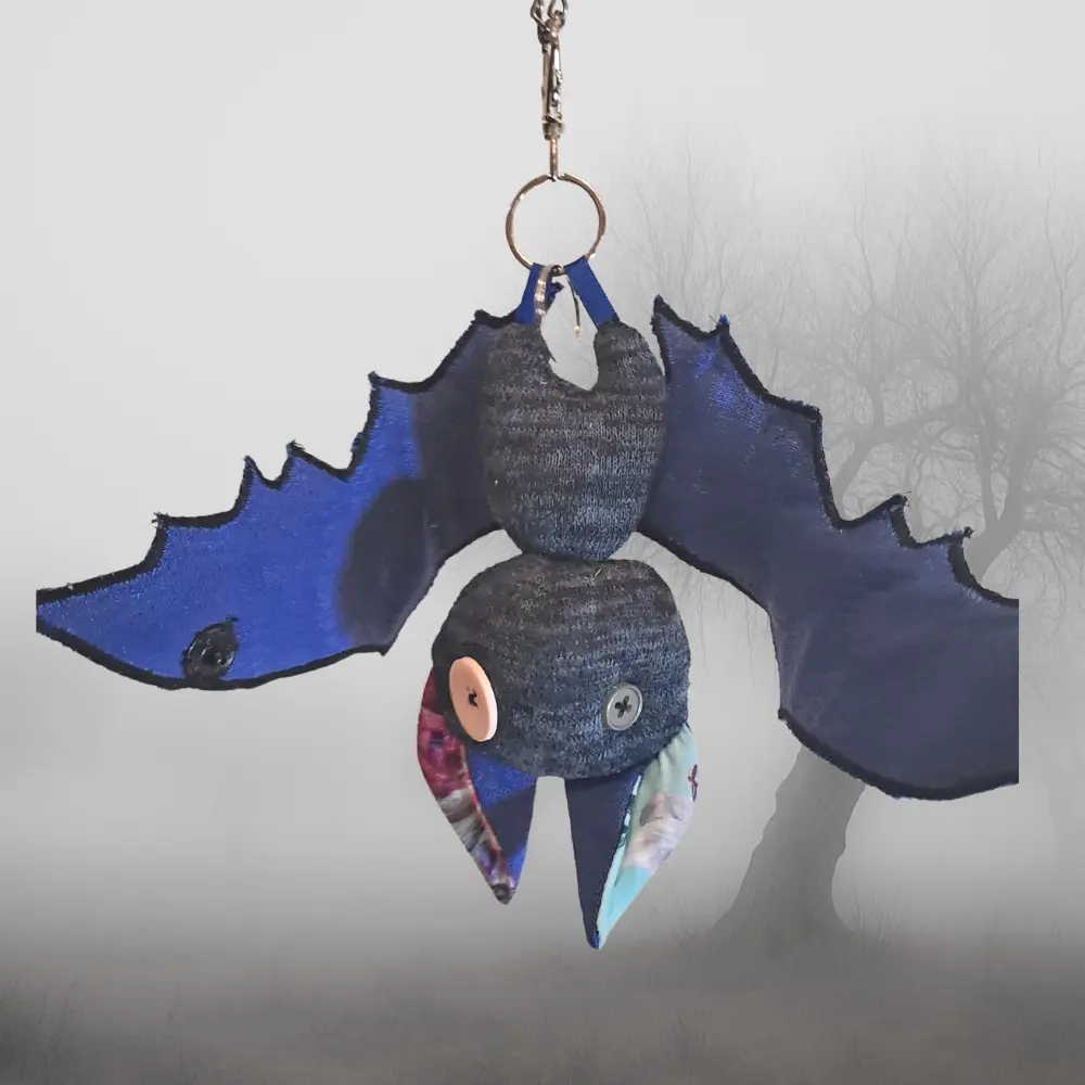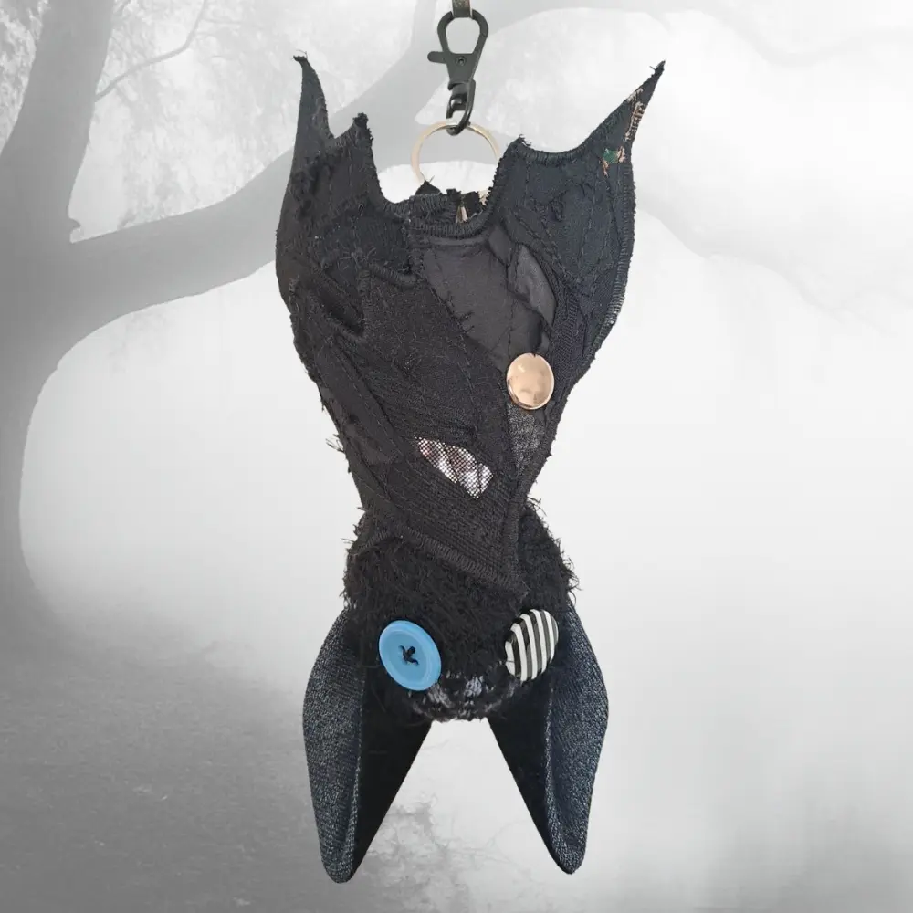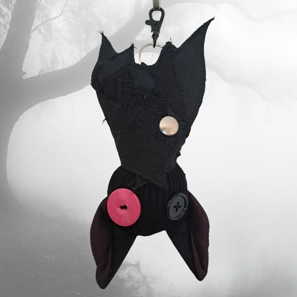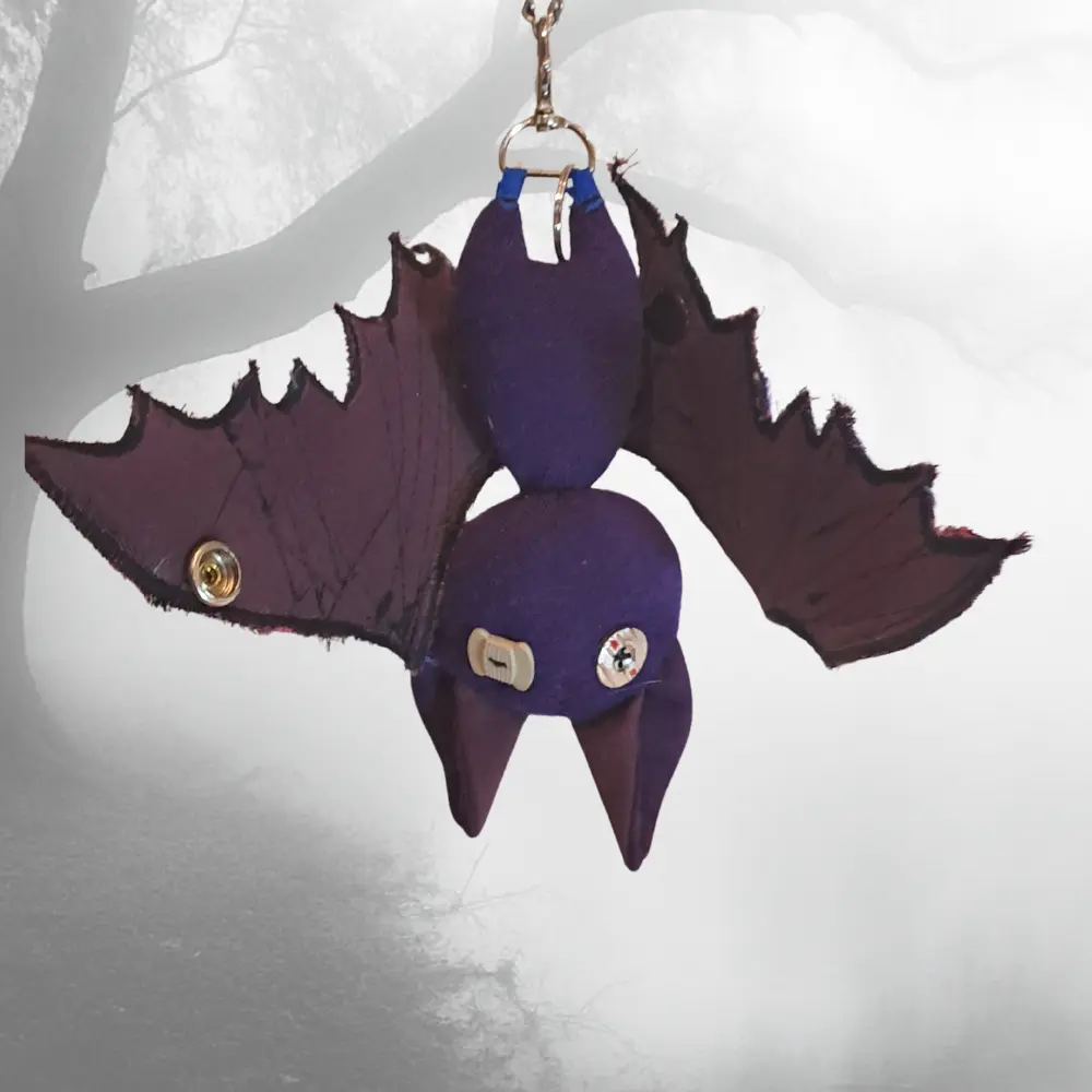 Upcycling con mucha actitud. Cada murciélago nace de los retales más pequeños — ninguno es igual al anterior. Para colgar del bolso, el pantalón, o donde te dé la gana.