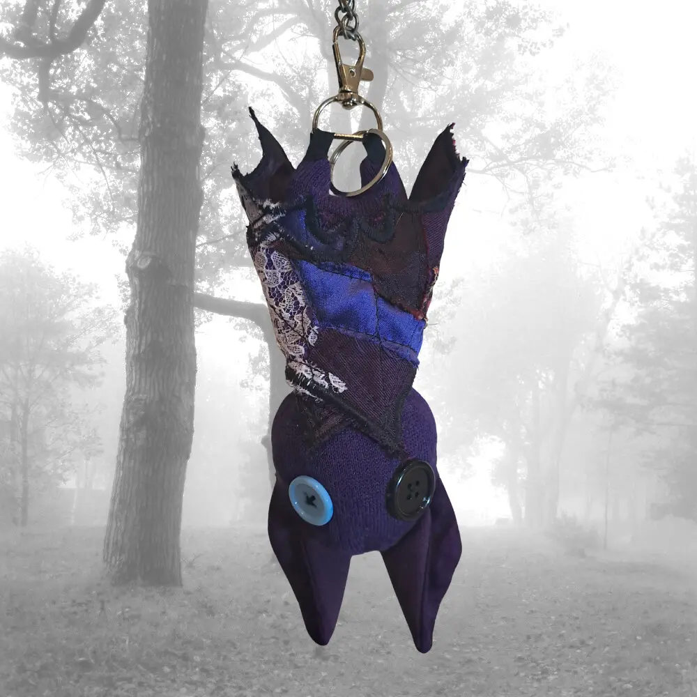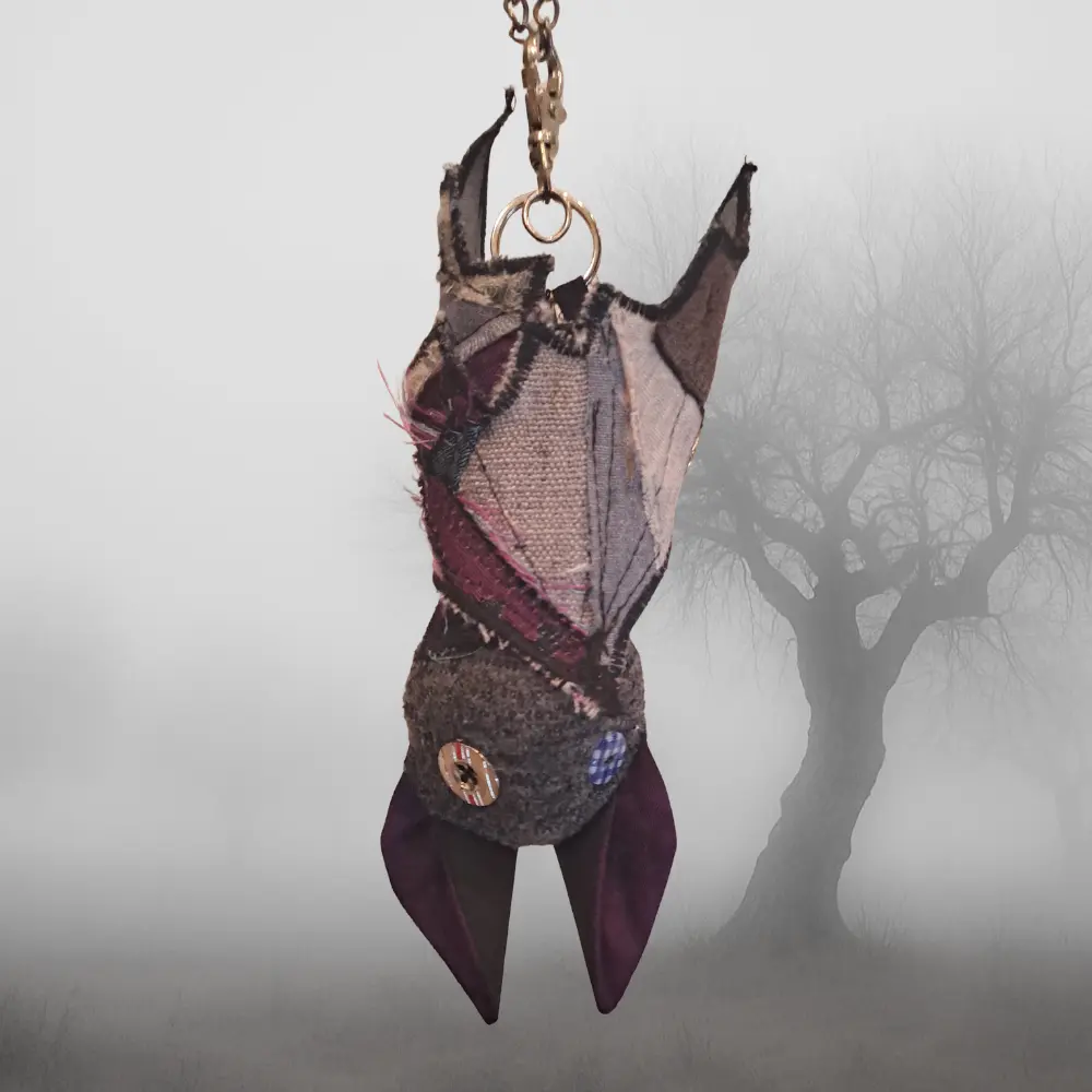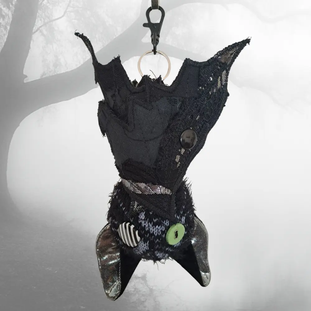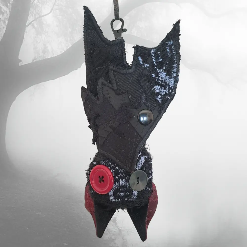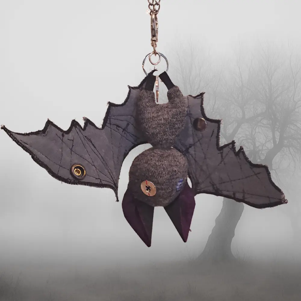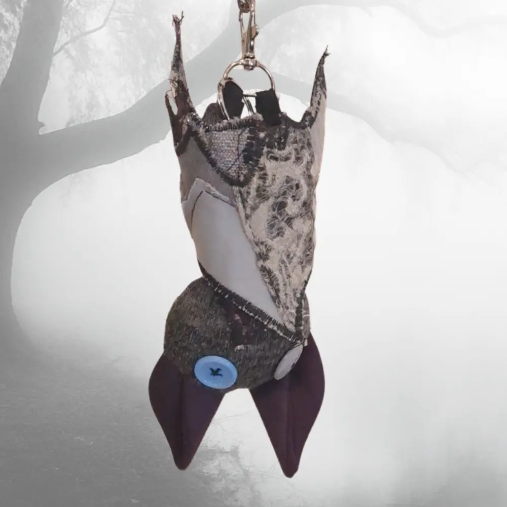 Upcycling con mucha actitud. Cada murciélago nace de los retales más pequeños — ninguno es igual al anterior. Para colgar del bolso, el pantalón, o donde te dé la gana.